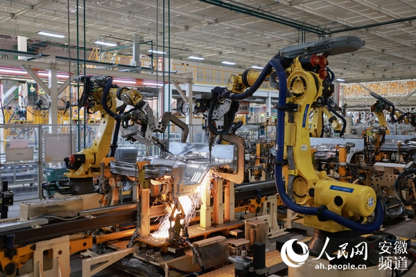 江汽集團(tuán)生產(chǎn)線。圖為機(jī)器人正在進(jìn)行焊接。人民網(wǎng) 王曉飛攝