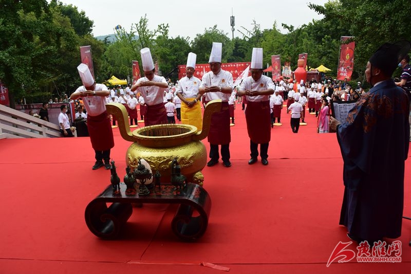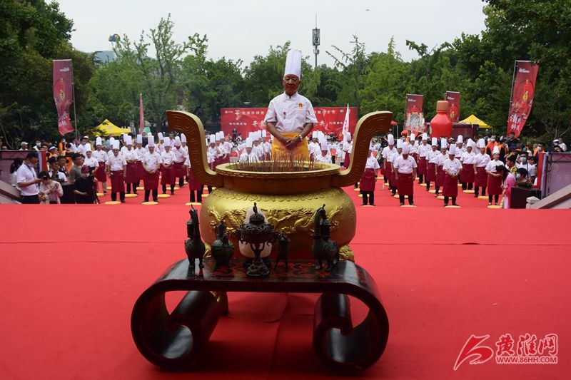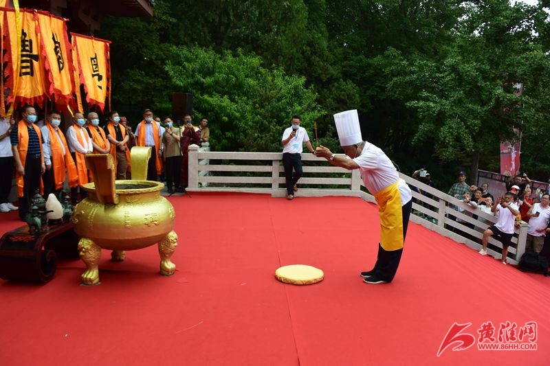 彭祖?zhèn)魅、中國烹飪大師王獻(xiàn)立率眾位烹飪大師、名師凈手上香,向彭祖行祭拜大禮。“彭祖圣火、生生不息,華夏廚人、代代相傳”眾位烹飪大師在彭祖前宣誓。