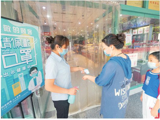 8月10日,德州市城區(qū)一家食品超市門口,工作人員在為顧客測量體溫,核驗(yàn)健康碼,使用酒精進(jìn)行手部消毒。