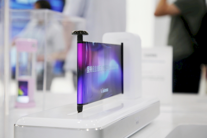 維信諾(合肥)G6全柔AMOLED生產(chǎn)線(xiàn)項(xiàng)目基地內(nèi)展示的卷軸式屏。合肥新站高新區(qū)供圖