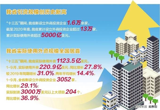 通過創(chuàng)新思路、主動(dòng)作為、攻堅(jiān)克難,我省引資規(guī)模創(chuàng)歷史新高。按商務(wù)部統(tǒng)計(jì)口徑,“十三五”期間,我省新設(shè)立外商投資企業(yè)1.6萬余家,實(shí)際使用外資1123.5億美元,規(guī)模居全國(guó)首位。今年1-9月,我省實(shí)際使用外資220.9億美元,規(guī)模繼續(xù)保持全國(guó)首位。