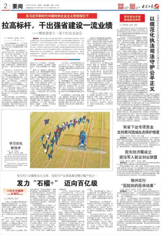 ■編者按 黨的十九屆六中全會(huì)是在我們黨成立一百周年的重大歷史時(shí)刻,在開啟全面建設(shè)社會(huì)主義現(xiàn)代化國(guó)家新征程之際召開的一次具有里程碑意義的重要會(huì)議。六中全會(huì)召開前夕,習(xí)近平總書記親臨山東視察,對(duì)做好山東工作作出重要指示要求,為山東發(fā)展指明了前進(jìn)方向,提供了科學(xué)指引,注入了強(qiáng)大動(dòng)力。近日召開的省委十一屆十四次全會(huì),研究制定了貫徹習(xí)近平總書記視察山東重要講話精神和重要指示要求的具體措施,對(duì)貫徹黨的十九屆六中全會(huì)精神作出部署。為動(dòng)員激勵(lì)全省廣大黨員干部切實(shí)把思想和行動(dòng)統(tǒng)一到六中全會(huì)精神上來(lái),全面深入貫徹落實(shí)總書記重要指示要求,按照省委部署埋頭苦干、勇毅前行,開創(chuàng)新時(shí)代社會(huì)主義現(xiàn)代化強(qiáng)省建設(shè)新局面,本報(bào)今起推出系列報(bào)道,敬請(qǐng)關(guān)注。