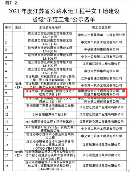 黃淮網(wǎng)(王中慶)  近日,中建五局洋河大道項目通過2021年度江蘇省公路水運工程平安工地建設(shè)省級“示范工地(工程)”考核評估,榮獲2021年度省級“示范工地”稱號。