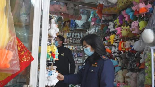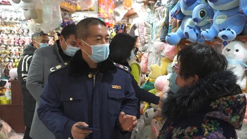 徐州宣武市場(chǎng)入口處張貼著“奧林匹克標(biāo)志保護(hù)在你我身邊”“自覺抵制侵犯知識(shí)產(chǎn)權(quán)行為”等宣傳標(biāo)語(yǔ)。市市場(chǎng)監(jiān)管局執(zhí)法人員先后走訪了該市場(chǎng)文體區(qū)、玩具區(qū)及批發(fā)區(qū)的多家店鋪,仔細(xì)查看有無(wú)“冰墩墩”“雪容融”及含有北京2022年冬奧會(huì)和冬殘奧會(huì)奧林匹克標(biāo)志相關(guān)產(chǎn)品。