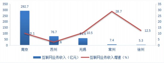 南京、蘇州、無錫、常州和徐州,相關企業(yè)的互聯(lián)網(wǎng)業(yè)務累計收入居全省前五名,共完成443.7億元,同比增長9.1%,占全省比重達97.2%。其中,南京以292.7億元的收入規(guī)模位居第一;ヂ(lián)網(wǎng)業(yè)務收入增速最快的為南通,增幅達303.9%;鎮(zhèn)江、常州為第二、第三名,增幅分別為35.5%和28.8%。