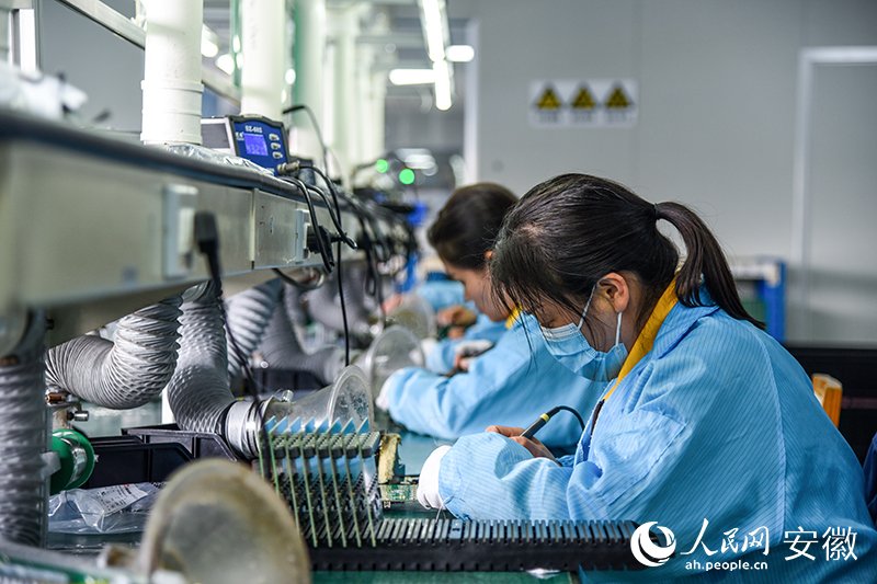 安徽中科光電色選機(jī)械有限公司電子元件加工車間內(nèi),工人正在焊接產(chǎn)品電子元件。人民網(wǎng) 李希蒙攝