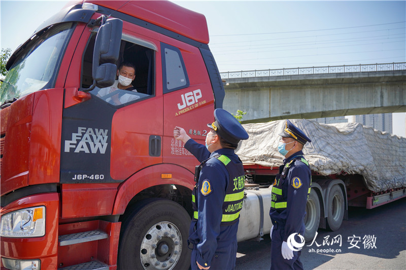 路政執(zhí)法人員正在對入肥卡車司機進行信息確認。人民網(wǎng) 陳若天攝