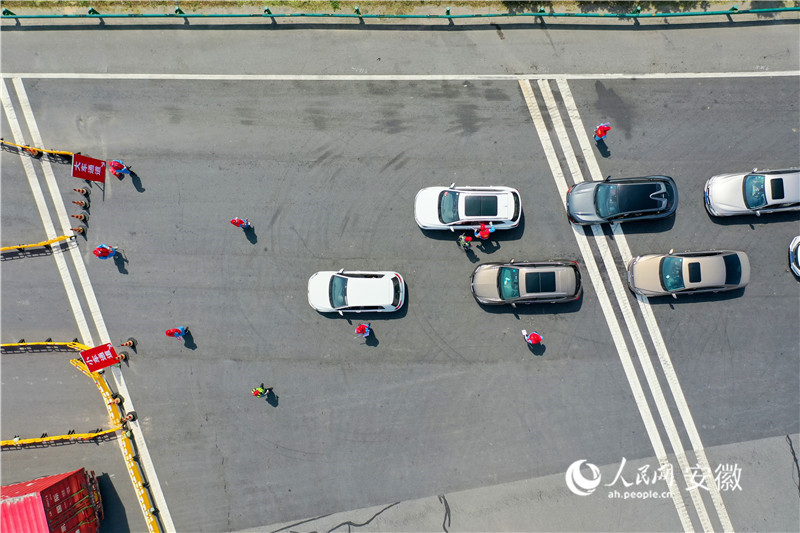 包河大道高速口處,路政執(zhí)法人員正在指揮車輛有序過檢。人民網(wǎng) 陳若天攝