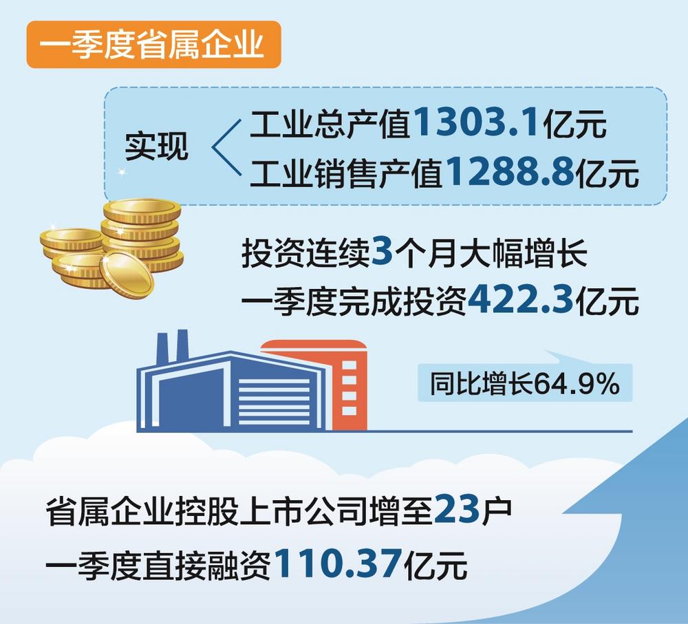 工業(yè)穩(wěn)則經(jīng)濟(jì)穩(wěn)。一季度,省屬企業(yè)實(shí)現(xiàn)工業(yè)總產(chǎn)值1303.1億元、工業(yè)銷售產(chǎn)值1288.8億元,同比均增長14.6%,煤炭、有色、化工等幾類企業(yè)產(chǎn)值增長較快。通過提質(zhì)增效,一季度省屬企業(yè)實(shí)現(xiàn)利潤總額175.6億元、同比增長10.1%,凈利潤132.9億元、同比增長11.9%。28戶省屬企業(yè)有25戶實(shí)現(xiàn)盈利、22戶同比增利,增利面近8成。3月底,省屬企業(yè)資產(chǎn)總額20275.8億元,歷史上首次突破2萬億元大關(guān),同比增長11.6%;平均資產(chǎn)負(fù)債率為57.1%,低于全國省級(jí)國資監(jiān)管企業(yè)平均水平14.5個(gè)百分點(diǎn)。