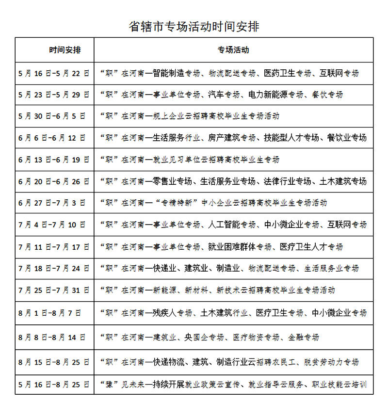 “百日千萬網(wǎng)絡(luò)招聘專項行動”將在中原人才網(wǎng)(www.zyrc.com.cn)設(shè)河南分會場,聯(lián)合智聯(lián)招聘(www.zhaopin.com/zhengzhou/)、工作啦(www.goworkla.cn)和天基人才網(wǎng)(www.tianjihr.com)共同開展各類主題的專場招聘活動,省轄市公共就業(yè)服務(wù)網(wǎng)站也將比照主會場設(shè)置板塊欄目,與主會場鏈接。