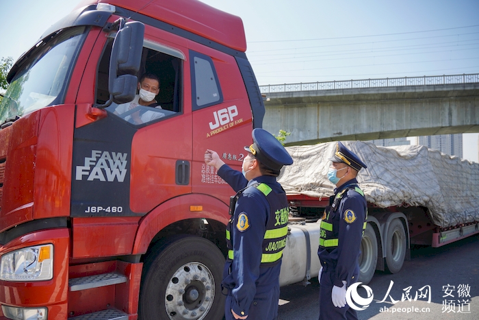 路政執(zhí)法人員正在對入肥卡車司機進行信息確認。人民網(wǎng) 陳若天攝