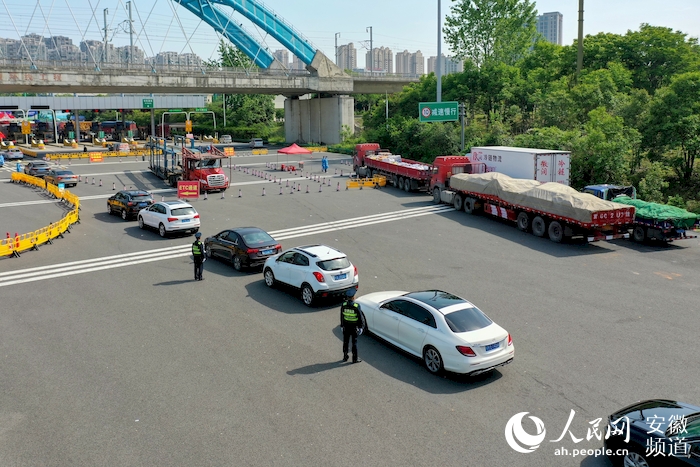 包河大道高速口處,路政執(zhí)法人員正在指揮車輛有序過檢。人民網(wǎng) 陳若天攝