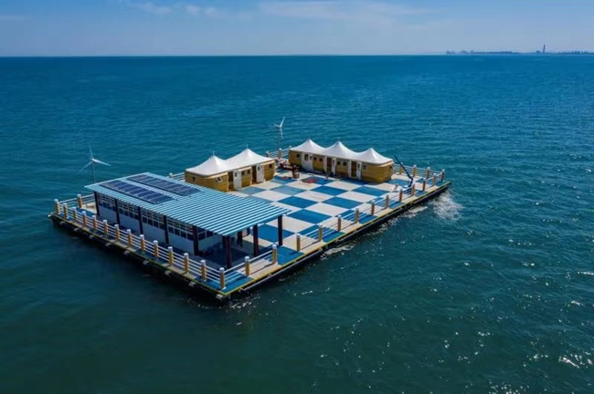 從煙臺(tái)龍口市西海岸坐快艇10分鐘,遠(yuǎn)遠(yuǎn)地便可以看見(jiàn)在茫茫大海中,有幾座像“蒙古包”似的建筑,這就是該市首座投入使用的半潛式海上多功能海洋牧場(chǎng)平臺(tái)。