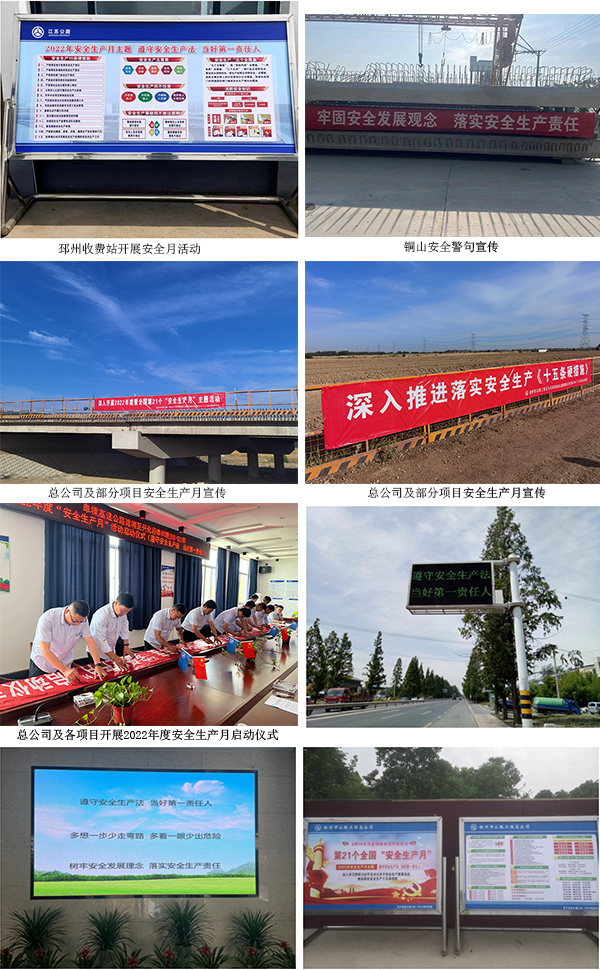 活動(dòng)開(kāi)始,徐州市公路系統(tǒng)組織廣大干部職工認(rèn)真學(xué)習(xí)貫徹習(xí)近平總書(shū)記關(guān)于安全生產(chǎn)重要論述,通過(guò)召開(kāi)部署會(huì),安全月啟動(dòng)宣誓簽名儀式,在機(jī)關(guān)、服務(wù)區(qū)、站所場(chǎng)點(diǎn)、施工現(xiàn)場(chǎng)等懸掛電子顯示屏和宣傳橫幅,設(shè)立展板開(kāi)設(shè)安全生產(chǎn)專欄等形式,全面開(kāi)展有重點(diǎn)、有力度、有特色、有成效的系列安全生產(chǎn)宣傳教育活動(dòng),營(yíng)造濃厚活動(dòng)氛圍,助力提升全市公路本質(zhì)安全水平,最大限度防范遏制各類事故發(fā)生,確保普通公路行業(yè)安全生產(chǎn)形勢(shì)總體穩(wěn)定,為黨的二十大勝利召開(kāi)營(yíng)造安全環(huán)境。