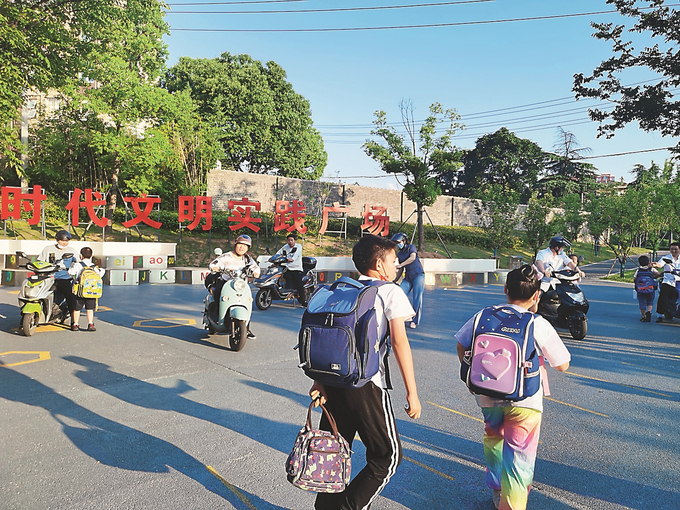 南京市棲霞區(qū)實(shí)驗(yàn)小學(xué)西門前的口袋公園廣場上,孩子們歡笑著跑向父母。 劉玉琴 攝