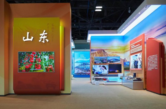 在地方展區(qū),山東單元精彩亮相,新時代社會主義現(xiàn)代化強省建設(shè)的壯美畫卷徐徐展開。大屏幕上循環(huán)播放著“走在前 開新局”成就宣傳片,“泰山日出”“藍黃交融”等地域元素和專屬文化符號融入展覽設(shè)計,與整個主題成就展協(xié)調(diào)一致。山東單元以深入貫徹落實習近平總書記對山東工作的重要指示要求為主線,緊扣“奮進新時代”主題,由單元說明和五個部分組成,五個部分包括“新發(fā)展理念開辟新舊動能轉(zhuǎn)換新天地”“勇當黃河流域生態(tài)保護和高質(zhì)量發(fā)展排頭兵”“鄉(xiāng)村振興齊魯樣板結(jié)出新碩果”“努力在發(fā)展海洋經(jīng)濟上走在前列”“不斷改善人民生活、促進共同富裕”。一件件實物模型、一段段生動視頻、一幅幅圖片圖表,彰顯著省委的政治定力、戰(zhàn)略定力和責任擔當,濃縮著齊魯大地日新月異的巨大變化。