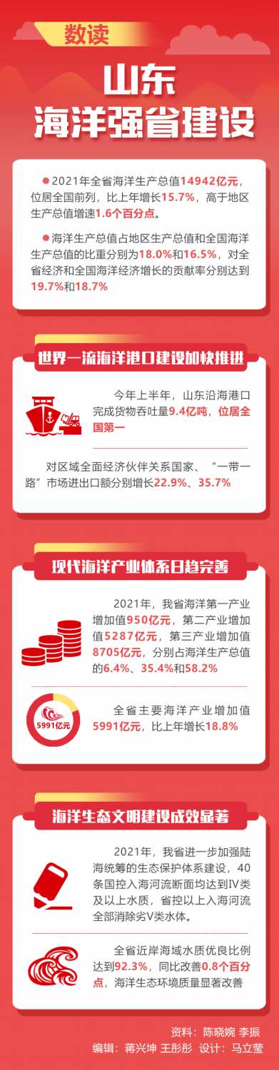 《山東省“十四五”海洋經(jīng)濟(jì)發(fā)展規(guī)劃》明確了走海洋經(jīng)濟(jì)發(fā)達(dá)、海洋科技領(lǐng)先、海洋環(huán)境優(yōu)美、海洋治理高效的現(xiàn)代化海洋強(qiáng)省之路。乘著經(jīng)略海洋的東風(fēng),山東正以海洋強(qiáng)省建設(shè)的實(shí)際成效,為建設(shè)海洋強(qiáng)國作出新貢獻(xiàn)。(陳曉婉 李振)
