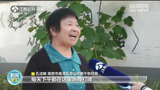 南京市高淳區(qū)游山村前干東村民孔潔娣說:“我們每天下午都在這里跳舞打牌,真開心。我去年剛回家(農(nóng)村),之前在在南京(主城區(qū))。鄉(xiāng)下比城里還要好,空氣好;貋砑,有人跟我說話。這十年變化很大,以前我們家生活很苦。”