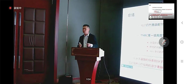 沈波教授發(fā)表線上致辭。他表示,隨著科技的不斷進(jìn)步,腫瘤學(xué)的治療進(jìn)展日新月異。祖國(guó)的傳統(tǒng)醫(yī)學(xué)在腫瘤防治方面發(fā)揮了重要作用。徐州市中醫(yī)院腫瘤一科楊靜教授團(tuán)隊(duì)在中西結(jié)合防治惡性腫瘤方面取得了很多優(yōu)異成果,中西醫(yī)結(jié)合診療模式在淮海經(jīng)濟(jì)區(qū)起到引領(lǐng)作用。相信在今后的工作中雙方能夠教學(xué)相長(zhǎng),相互學(xué)習(xí)、相互促進(jìn),共同努力為徐州腫瘤事業(yè)的發(fā)展做出貢獻(xiàn)。
