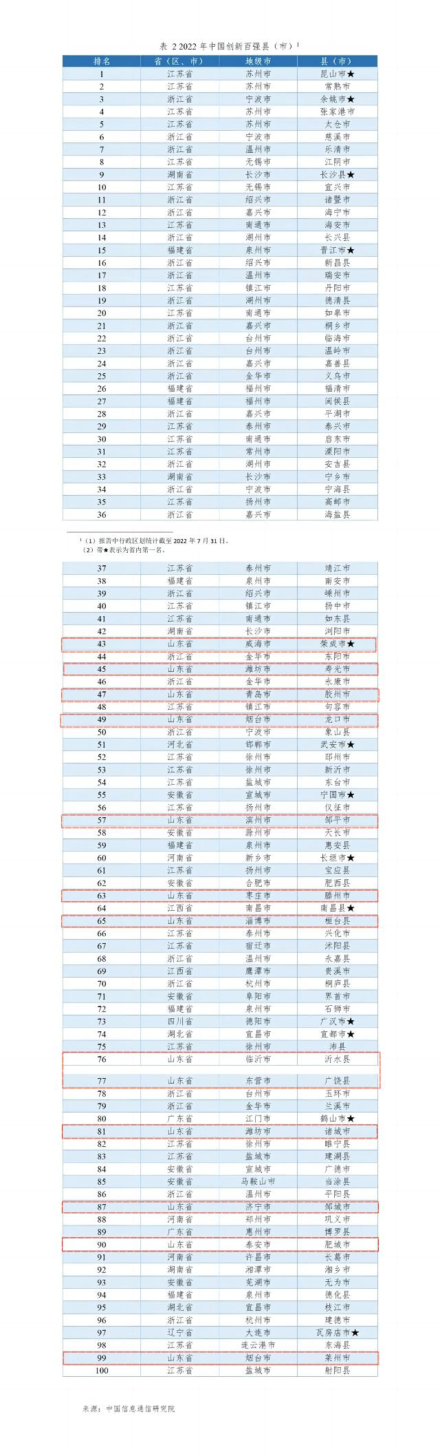 山東榮成市、壽光市、膠州市、龍口市、鄒平市、滕州市、桓臺(tái)縣、沂水縣、廣饒縣、諸城市、鄒城市、肥城市、萊州市等入選2022年中國(guó)創(chuàng)新百?gòu)?qiáng)縣(市);