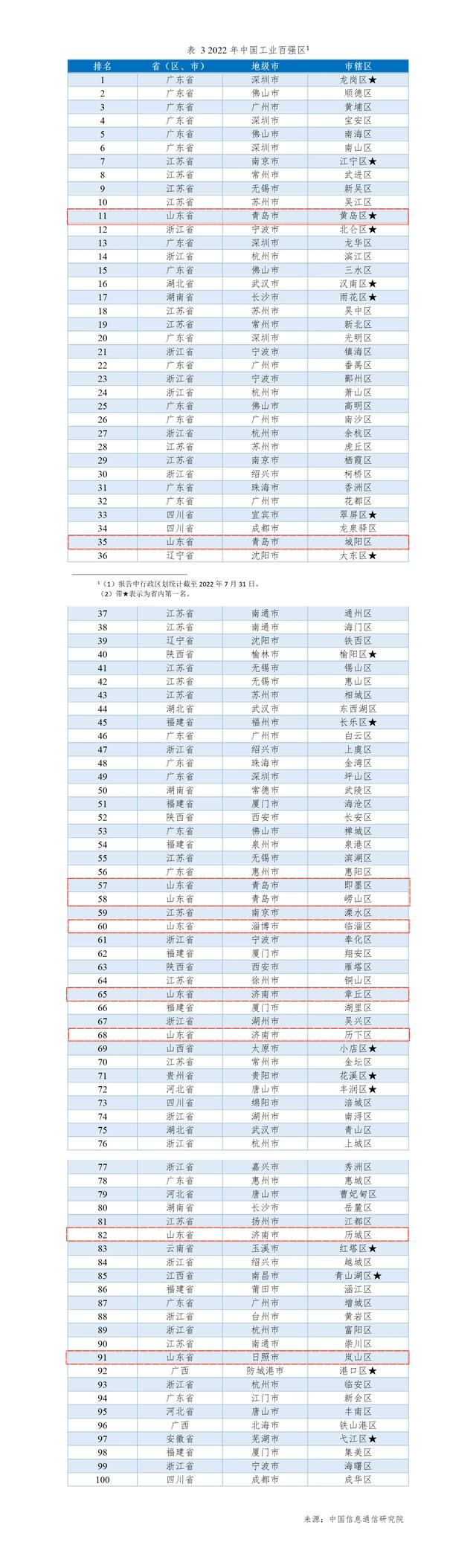 山東青島市黃島區(qū)、城陽(yáng)區(qū)、即墨區(qū)、嶗山區(qū),淄博市臨淄區(qū),濟(jì)南市章丘區(qū)、歷下區(qū)、歷城區(qū),日照市嵐山區(qū)等入選2022年中國(guó)工業(yè)百?gòu)?qiáng)區(qū)。