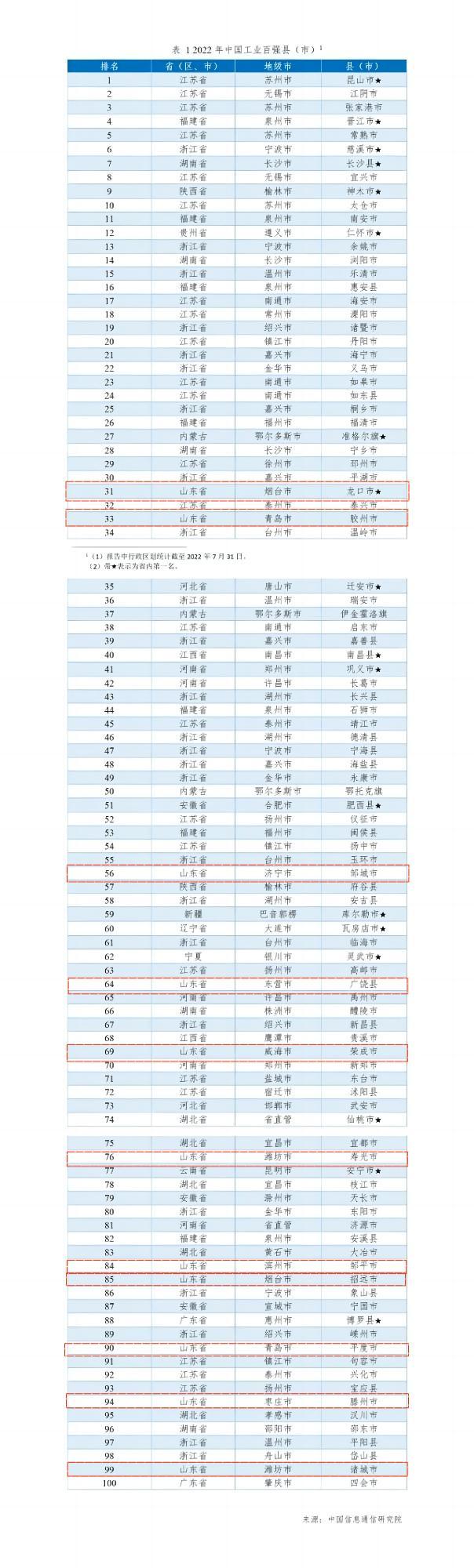 山東龍口市、膠州市、鄒城市、廣饒縣、榮成市、壽光市、鄒平市、招遠(yuǎn)市、平度市、滕州市、諸城市等入選2022年中國(guó)工業(yè)百?gòu)?qiáng)縣(市);