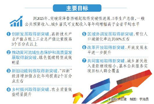 《行動計劃》明確了突破菏澤、魯西崛起的主要目標:到2025年,五市生產(chǎn)總值、一般公共預(yù)算收入、城鄉(xiāng)居民可支配收入等年均增幅高于全省平均水平并取得七個方面突破。創(chuàng)新發(fā)展取得新突破,高新技術(shù)產(chǎn)業(yè)產(chǎn)值占規(guī)上工業(yè)總產(chǎn)值比重提高3個百分點以上;推動黃河流域生態(tài)保護和高質(zhì)量發(fā)展取得新突破,綠色低碳轉(zhuǎn)型成效明顯;新舊動能轉(zhuǎn)換取得新突破,“四新”經(jīng)濟增加值占比年均提高2個百分點左右;鄉(xiāng)村振興取得新突破,農(nóng)業(yè)質(zhì)量效益明顯提升;區(qū)域協(xié)調(diào)發(fā)展取得新突破,常住人口城鎮(zhèn)化率達到60%左右;改革開放取得新突破,開放發(fā)展水平進一步提升;共同富裕取得新突破,城鄉(xiāng)居民收入差距繼續(xù)縮小,基本公共服務(wù)實現(xiàn)目標人群全覆蓋。