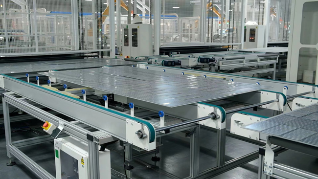 山東泉為新能源科技有限公司生產(chǎn)車間,高效異質(zhì)結(jié)光伏組件正在下線。棗莊市委網(wǎng)信辦供圖