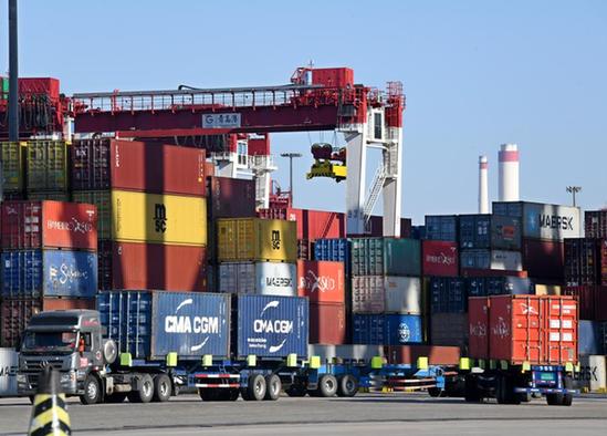 在青島港前灣集裝箱碼頭,貨車在運(yùn)送集裝箱。新華社記者李紫恒 攝