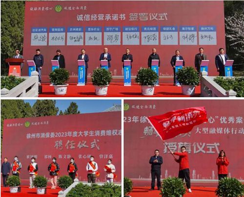活動現(xiàn)場,市消保委發(fā)布2022年徐州市直播帶貨領域消費者滿意度調(diào)查報告;蘇寧廣場、海爾電器、徐州萬科、比亞迪汽車、綠健乳業(yè)、恩華藥業(yè)、建設銀行、1818park、徐州樂園、青島啤酒共同簽署誠信經(jīng)營公開承諾書;還舉行了2023年“提振消費信心”優(yōu)秀案例征集暨3·15“暢享新消費”大型融媒體行動授旗儀式、徐州市消保委2023年度大學生消費維權志愿者聘任儀式。徐州漢風號客戶端全程直播當天的現(xiàn)場活動,并開通網(wǎng)上直播間,邀請職能部門、商家代表、專家學者等參與訪談,共吸引了10萬余名網(wǎng)友參與互動。
