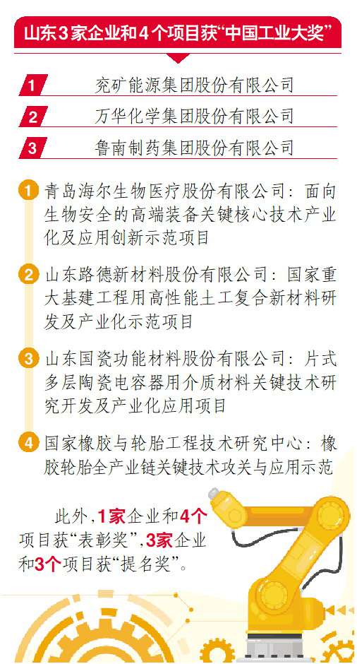 獲得“中國工業(yè)大獎(jiǎng)”的3家企業(yè)分別為兗礦能源集團(tuán)股份有限公司、萬華化學(xué)集團(tuán)股份有限公司、魯南制藥集團(tuán)股份有限公司;4個(gè)項(xiàng)目分別為青島海爾生物醫(yī)療股份有限公司的面向生物安全的高端裝備關(guān)鍵核心技術(shù)產(chǎn)業(yè)化及應(yīng)用創(chuàng)新示范項(xiàng)目、山東路德新材料股份有限公司的國家重大基建工程用高性能土工復(fù)合新材料研發(fā)及產(chǎn)業(yè)化示范項(xiàng)目、山東國瓷功能材料股份有限公司的片式多層陶瓷電容器用介質(zhì)材料關(guān)鍵技術(shù)研究開發(fā)及產(chǎn)業(yè)化應(yīng)用項(xiàng)目、國家橡膠與輪胎工程技術(shù)研究中心(軟控股份有限公司、青島科技大學(xué)、賽輪集團(tuán)股份有限公司)的橡膠輪胎全產(chǎn)業(yè)鏈關(guān)鍵技術(shù)攻關(guān)與應(yīng)用示范。