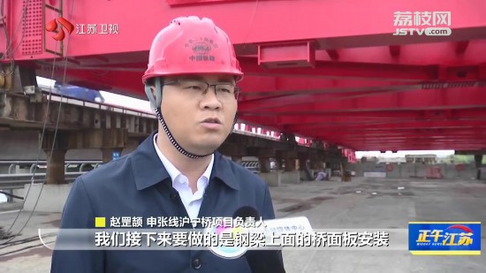 申張線滬寧橋項(xiàng)目負(fù)責(zé)人趙罡頡說:“鋼梁頂推完成以后,我們接下來要做的是鋼梁上面的橋面板安裝,同時(shí)要施工鋼梁兩側(cè)引橋的橋面系及其附屬結(jié)構(gòu)施工。”