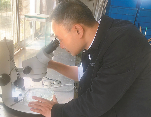 聞海波在實(shí)驗(yàn)室中觀察蟶蚌幼苗。 丁蔚文攝