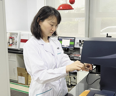 南京市產(chǎn)品質(zhì)量監(jiān)督檢驗院綠色可降解材料質(zhì)檢中心副主任朱南幫企業(yè)做測試實驗。