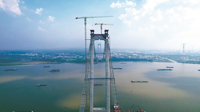日前,常泰長(zhǎng)江大橋北主塔中塔柱施工完成,全面轉(zhuǎn)入上塔柱施工。中交二航局常泰大橋項(xiàng)目常務(wù)副經(jīng)理王輝介紹:“天星洲專(zhuān)用航道橋是大橋重要組成部分,鋼桁梁架設(shè)正在加速推進(jìn),目前已完成38個(gè)節(jié)間架設(shè)。”