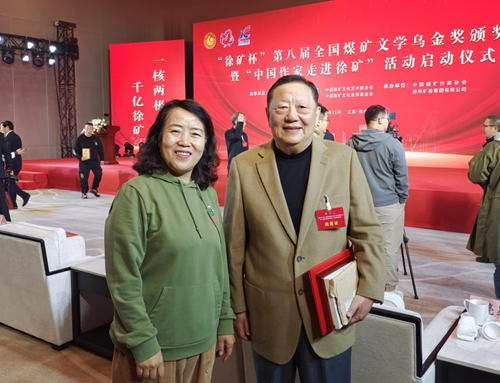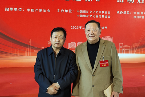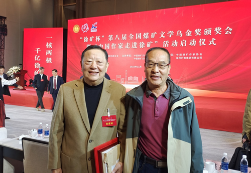 中國(guó)煤礦作協(xié)副主席、本屆烏金獎(jiǎng)獲得者、中國(guó)礦大人文和藝術(shù)學(xué)院教授史修永(右)與沙凡合影