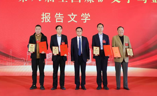 中國(guó)煤礦文聯(lián)副主席、徐礦集團(tuán)副總經(jīng)理陳偉東(中)與本屆報(bào)告文學(xué)獲獎(jiǎng)作者合影