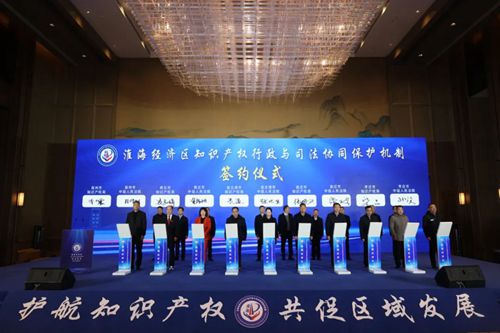 會議簽署了《關(guān)于加強地理標志知識產(chǎn)權(quán)協(xié)同保護的實施意見書》;宣讀了《淮海經(jīng)濟區(qū)知識產(chǎn)權(quán)行政與司法協(xié)同保護協(xié)議書》并簽署了協(xié)議。