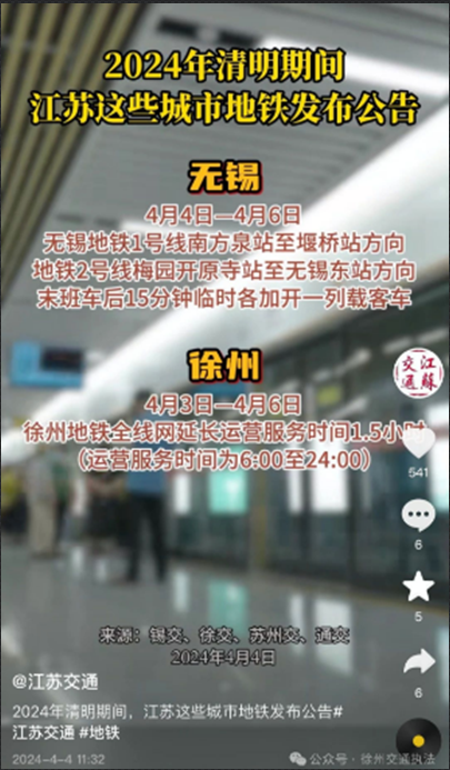 二是延長(zhǎng)地鐵運(yùn)營(yíng)時(shí)間。4月3日至6日,地鐵全線網(wǎng)延長(zhǎng)運(yùn)營(yíng)服務(wù)時(shí)間1.5小時(shí)(運(yùn)營(yíng)時(shí)間6:00-24:00),運(yùn)營(yíng)期間加強(qiáng)客流監(jiān)測(cè),做好應(yīng)對(duì)大客流的情況,節(jié)日期間,未接報(bào)發(fā)生地鐵運(yùn)營(yíng)安全危險(xiǎn)性事故,安全形勢(shì)平穩(wěn)。
