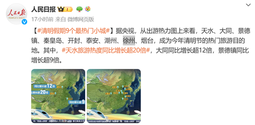 據(jù)4月6日人民日?qǐng)?bào)官微發(fā)布:從出游熱力圖上來(lái)看,天水、大同、景德鎮(zhèn)、秦皇島、徐州等地成為今年清明節(jié)的熱門(mén)旅游目的地。綜合各方數(shù)據(jù)測(cè)算,2024年清明假日期間,徐州市共接待游客325.6萬(wàn)人次。