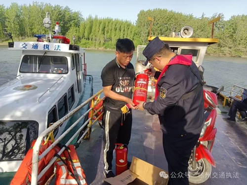​藺家壩中隊(duì)前往轄區(qū)渡口為渡船發(fā)放滅火器并指導(dǎo)使用。