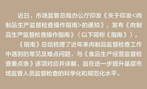 近日,市場(chǎng)監(jiān)管總局正式發(fā)布《肉制品生產(chǎn)監(jiān)督檢查操作指南》(以下簡(jiǎn)稱《指南》)!吨改稀房偨Y(jié)梳理了近年來肉制品監(jiān)督檢查工作中遇到的常見及難點(diǎn)問題,與《食品生產(chǎn)經(jīng)營監(jiān)督檢查要點(diǎn)表》逐項(xiàng)對(duì)應(yīng)并詳解,旨在進(jìn)一步提升基層市場(chǎng)監(jiān)管人員監(jiān)督檢查的科學(xué)化和規(guī)范化水平。