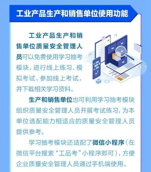 近日,市場(chǎng)監(jiān)管總局正式啟用工業(yè)產(chǎn)品生產(chǎn)和銷售單位質(zhì)量安全管理人員學(xué)習(xí)抽考模塊(https://www.cnis.ac.cn/zt/gsxdzagrkp/),并適配了微信小程序(在微信平臺(tái)搜索“工品考”小程序即可),借助信息化手段方便企業(yè)質(zhì)量安全管理人員學(xué)習(xí)和模擬考試,便利地方各級(jí)市場(chǎng)監(jiān)管部門組織產(chǎn)品質(zhì)量安全知識(shí)線上線下監(jiān)督抽考。
