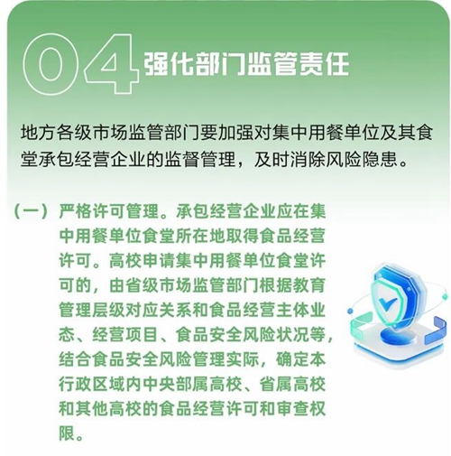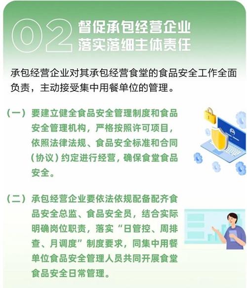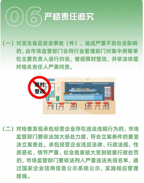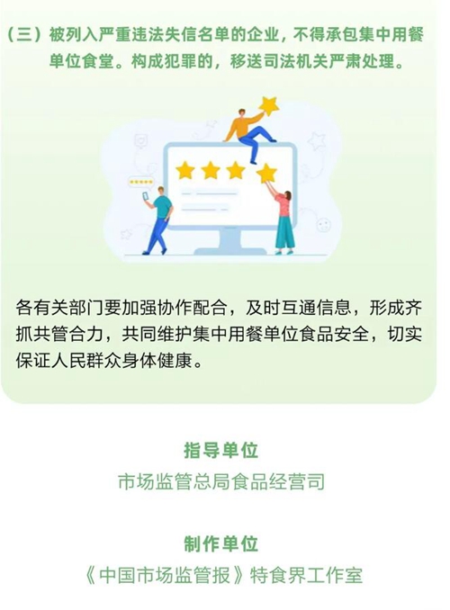 集中用餐單位對(duì)本單位食品安全負(fù)總責(zé),承包經(jīng)營(yíng)企業(yè)對(duì)其承包經(jīng)營(yíng)食堂的食品安全工作全面負(fù)責(zé);各地行業(yè)主管部門應(yīng)強(qiáng)化行業(yè)管理責(zé)任,市場(chǎng)監(jiān)管部門應(yīng)強(qiáng)化監(jiān)管責(zé)任,加強(qiáng)要點(diǎn)檢查,實(shí)施聯(lián)合懲戒和信用管理。