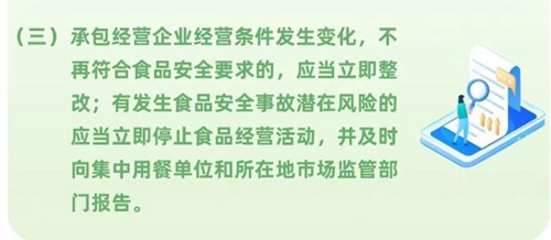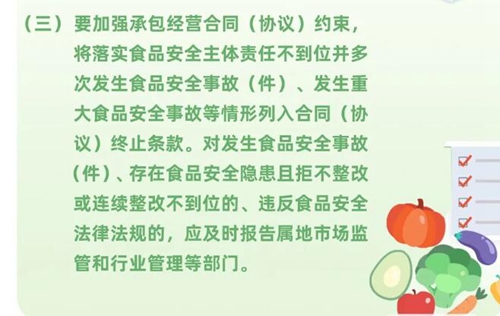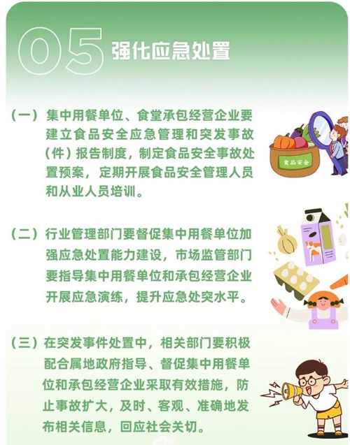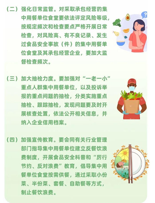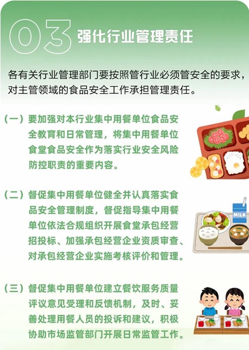 要推動(dòng)集中用餐單位落實(shí)食品安全責(zé)任,督促承包經(jīng)營(yíng)企業(yè)落實(shí)落細(xì)主體責(zé)任,強(qiáng)化行業(yè)管理責(zé)任,強(qiáng)化部門監(jiān)管責(zé)任,強(qiáng)化應(yīng)急處置,嚴(yán)格責(zé)任追究等。各有關(guān)部門要加強(qiáng)協(xié)作配合,及時(shí)互通信息,形成齊抓共管合力,共同維護(hù)集中用餐單位食品安全。