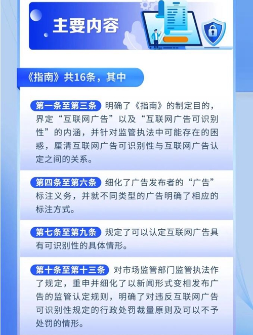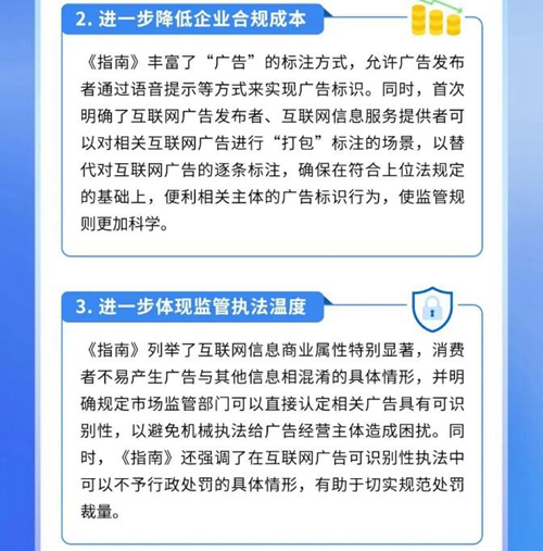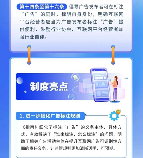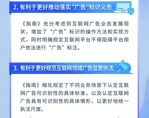 《指南》細化了標注“廣告”的義務主體、具體方式,有效解決了“誰來標注、怎么標注”的問題,明確了相關廣告活動主體在提升互聯(lián)網(wǎng)廣告可識別性方面的責任義務,讓監(jiān)管規(guī)則更加清晰透明、可預期。