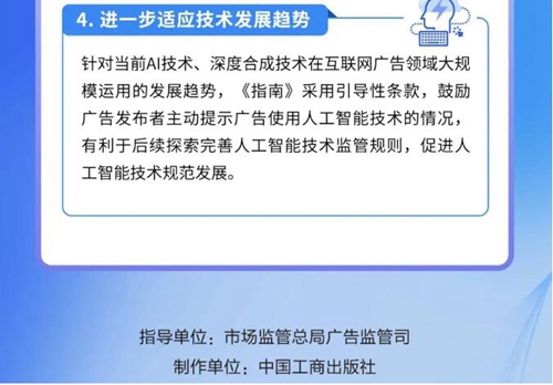 針對當前人工智能(AI)技術、深度合成技術在互聯(lián)網(wǎng)廣告領域大規(guī)模運用的發(fā)展趨勢,《指南》采用引導性條款,鼓勵廣告發(fā)布者主動提示廣告使用人工智能技術的情況,有利于后續(xù)完善相關監(jiān)管規(guī)則,促進人工智能技術規(guī)范發(fā)展。