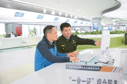 優(yōu)化營商環(huán)境,是培育和激發(fā)經(jīng)營主體活力、增強發(fā)展內(nèi)生動力的關(guān)鍵之舉。圖為2023年11月27日,在湖北省宜昌市市民之家市場監(jiān)管局窗口,工作人員指導(dǎo)企業(yè)人員在線辦理企業(yè)登記注冊業(yè)務(wù)。湖北省宜昌市市場監(jiān)管局供圖