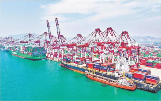 在山東港口青島港前灣集裝箱碼頭,輪船在停泊作業(yè)。(□新華社發(fā))