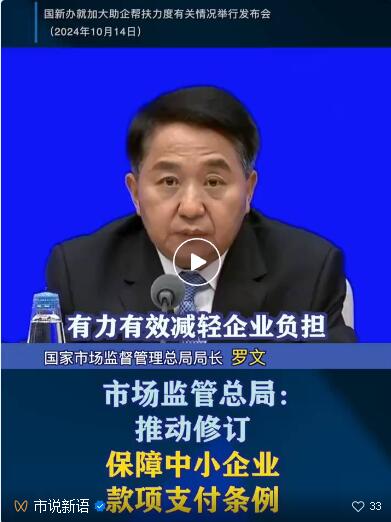國務(wù)院新聞辦公室于10月14日舉行新聞發(fā)布會,請國家市場監(jiān)督管理總局、工業(yè)和信息化部、司法部、國家金融監(jiān)督管理總局相關(guān)負(fù)責(zé)人介紹加大助企幫扶力度有關(guān)情況。一起來看——